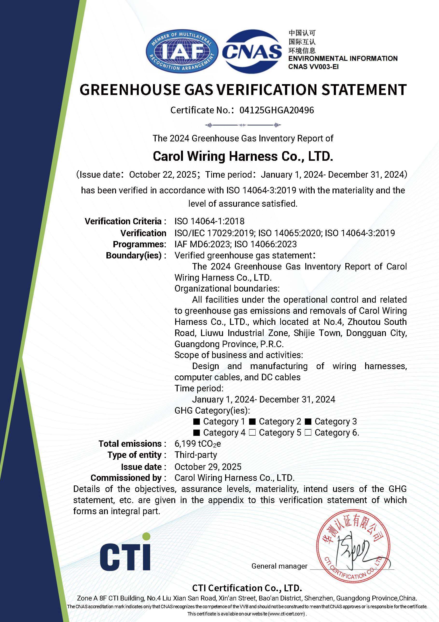 To meet customer needs, both DONGGUAN CAROL WIRING HARNESS CO.,LTD. and SUZHOU CAROL WIRING HARNESS CO.,LTD. factories have passed ISO 9001, IATF16949, ISO14001, ISO14064-1, IECQ QC 080000, UL/CSA certifications. EVERLONG ELECTRIC(DONG GUAN)CO.,LTD.Factory is more in line with SONY GP (Green Partner Certification) certification and provides comprehensive customized wire services.